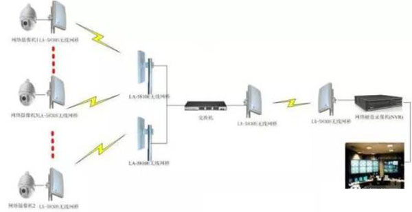在具体监控系统实施环境中,如果布线困难碰到天然屏障或者不可逾越的障碍的时候,我们可以使用无线传输方式,这样就用到无线网桥了。