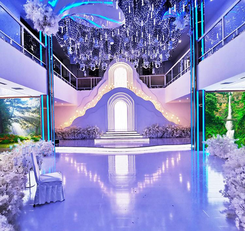 比如,在婚礼场景应用中,LED显示大屏可以用动态的屏幕效果,替代静止的花艺纱幔背景,让婚礼现场更具特色和个性。